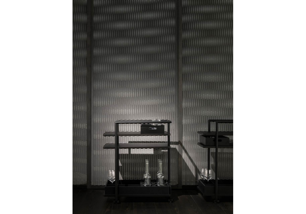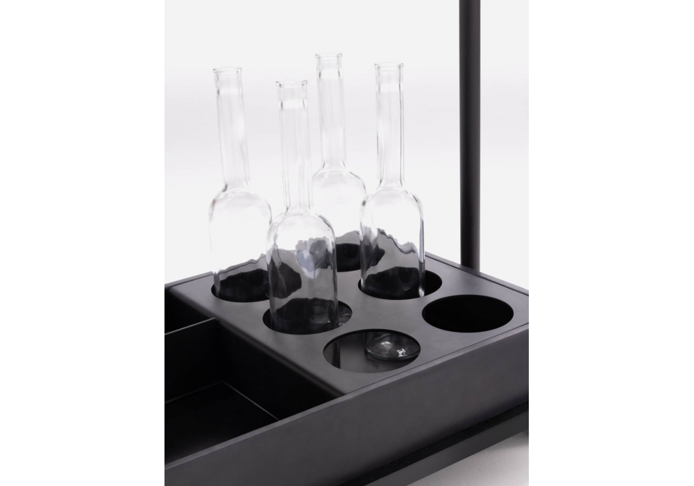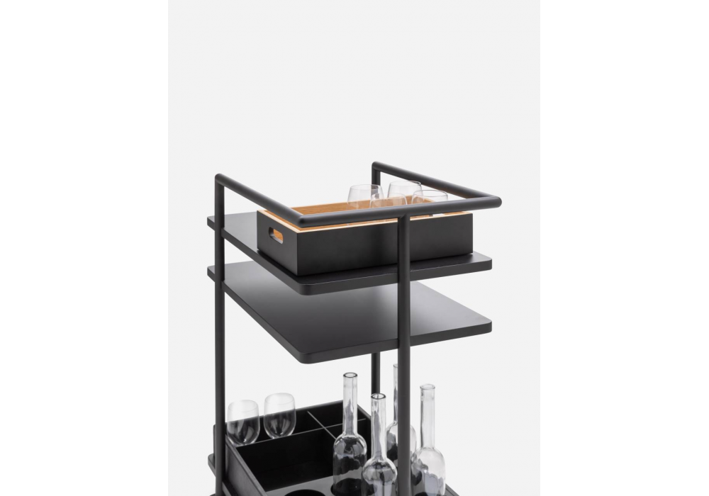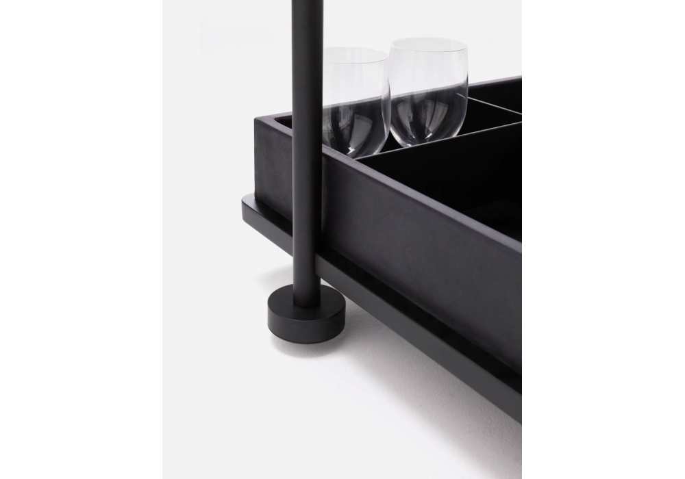 Aero T designed by Shibuleru for Living Divani is a trolley featuring two shelves and an open container enclosed in a metal structure in a matt black finish. Swivel wheels covered in rubber. The shelves are in MDF finished with a scratch-resistant frame and an open container composed of an MDF top and HPL frame covered in black leather and fixed to the top. The internal sides, edges and bottom of the tray are made in various finishes.