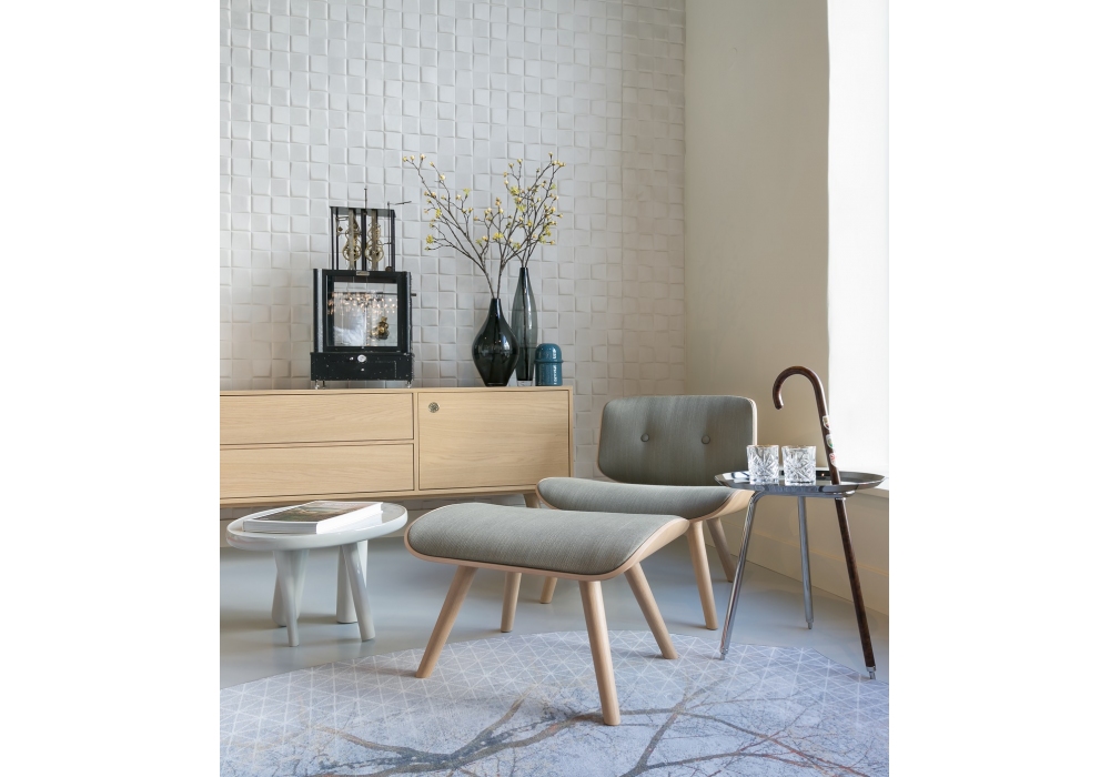Nut designed by Marcel Wanders for Moooi is a footstool with covering in fabric or leather and frame in bent plywood with oak veneer, solid oak legs available in several finishes.