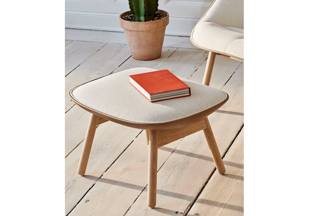 Uchiwa Ottoman designed by Doshi Levien for Hay is an ottoman made with shell in polypropylene reinforced with molded polyurethane foam, base in water-based lacquered solid oak and internal and external upholstery in fabric or leather. Available in different upholstery.