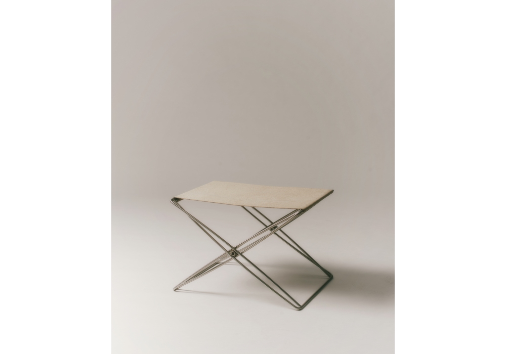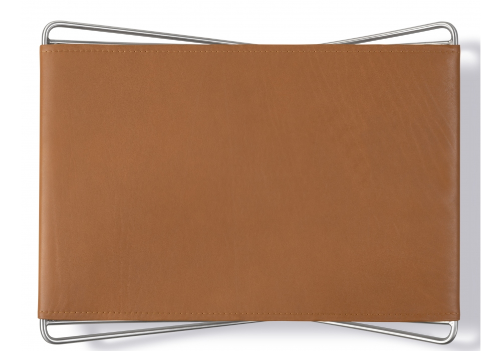 JG designed by Jørgen Gammelgaard for Fredericia is a folding footstool with stainless steel structure and leather or canvas seat. The leather seat has canvas backing.