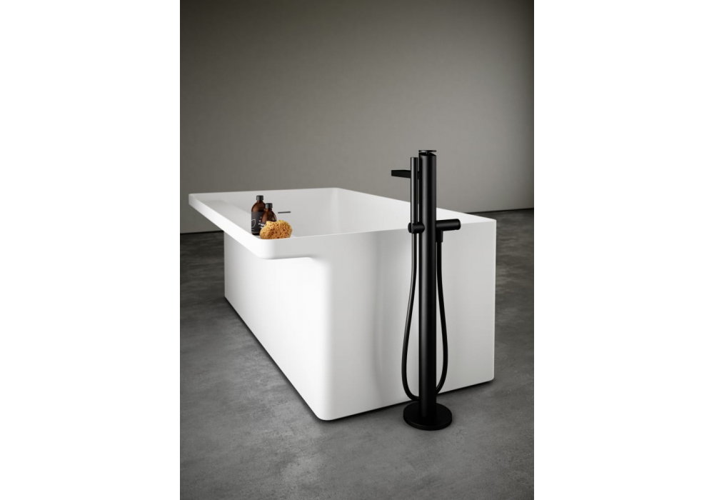 Sen designed by Gwenael Nicolas, Curiosity for Agape is a floor-standing single-hole mixer tap for bathtubs made of brushed anodized aluminum with a black finish. Available in the version with or without shower.