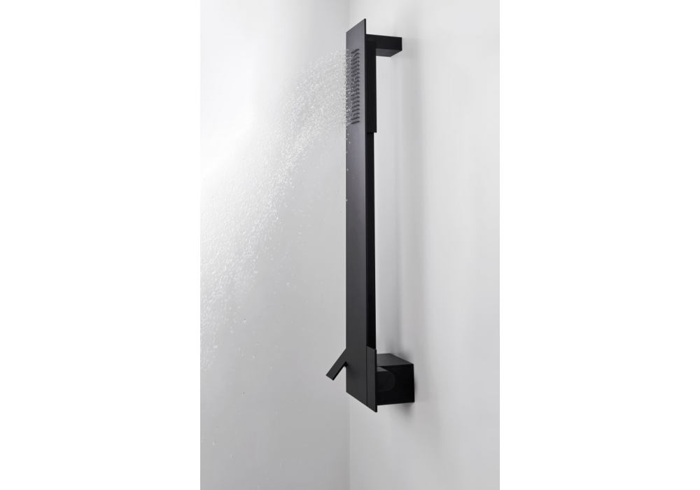 Sen signed by Gwenael Nicolas, Curiosity for Agape is a wall-mounted shower tap with shower head, made of brushed anodized aluminum with a black finish.