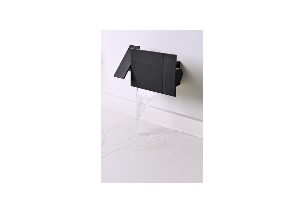 Sen signed by Gwenael Nicolas, Curiosity for Agape is a wall-mounted tap made of brushed anodized aluminum with a black finish, for a washbasin with horizontal spout.