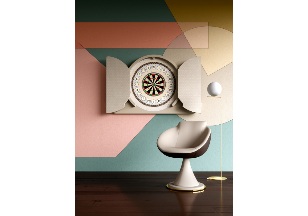 Darts cabinet set designed by Vismara Design is a darts cabinet with target. African sisal darts, lacquered wood cabinet, steel dart holder, including two sets of steel tip darts. Doors available in Circus Edition.