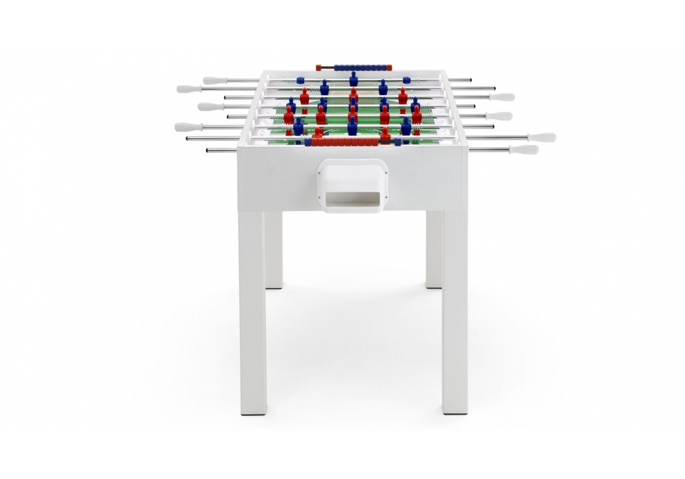 Fido designed by Basaglia + Rota Nodari for Fas Pendenza is a quadrangular table football table with a playing field in highly resistant tempered glass. The cabinet is made of MDF covered in plastic laminate. The legs are quadrangular in shape in metal box with scratch-resistant paint. Fido is available in different finishes and shaft versions, supplied with 5 white game balls.