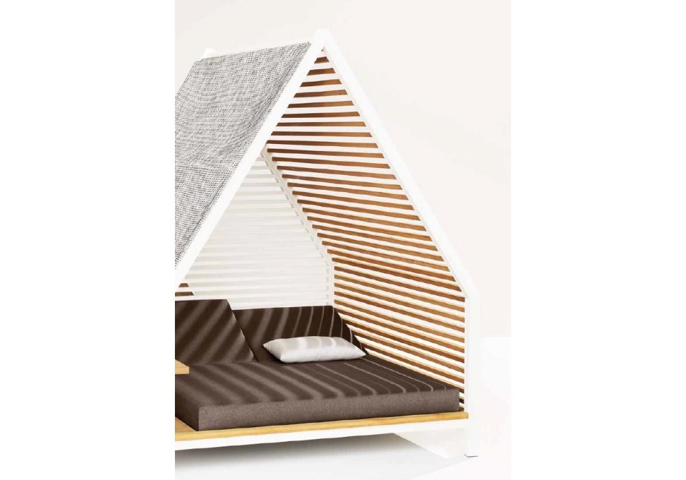 Cottage designed by Patricia Urquiola for Kettal is an outdoor daybed/gazebo with a frame made entirely of aluminum. The roof is double-pitched made of aluminum and porotex with a fabric curtain. The bed has a reclining backrest padded and covered in fabric. Cottage is available in different frame and fabric finishes.