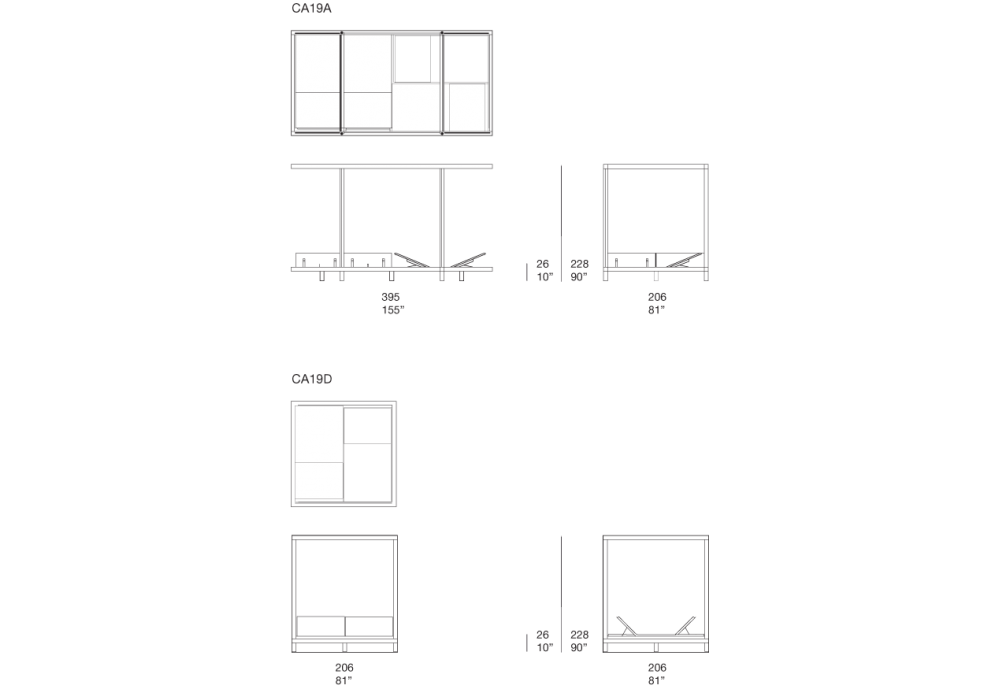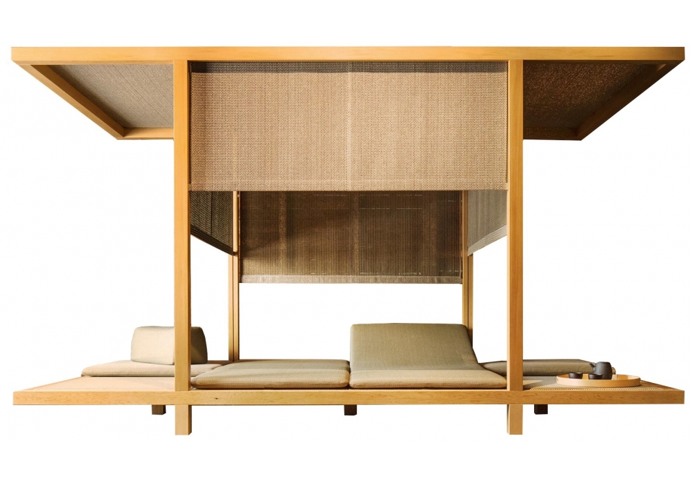 Toku designed by Vincent Van Duysen for Paola Lenti is a shading structure with seats equipped with a mattress, perfect for furnishing outdoor environments with style. Structure in solid cedar wood, cover panels and side sliding curtains in fabric. Mattress with removable fabric cover.