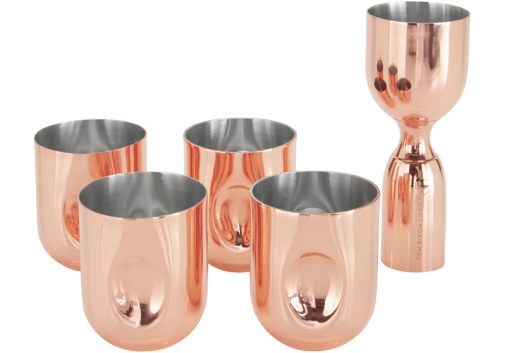 Plum Shot Giftset designed by Tom Dixon is a set consisting of four shot glasses and measuring cup, made of solid steel in a shiny copper finish.