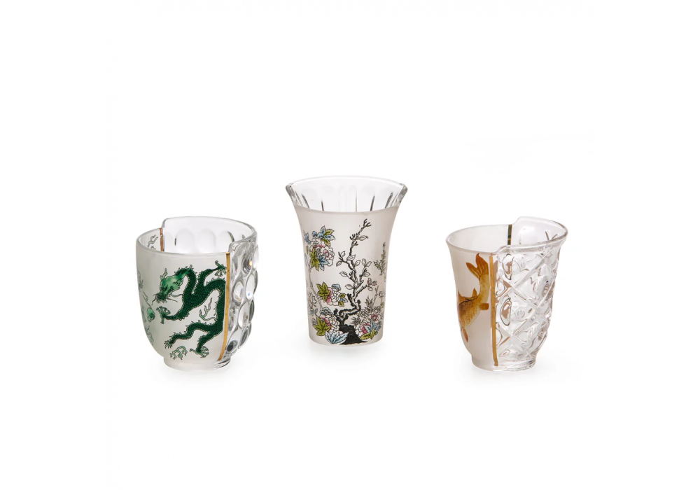 Hybrid Aglaura designed by CTRLZAK is a set of glass glasses made by combining two opposing shapes. The surface is half decorated and half transparent with a textured surface.