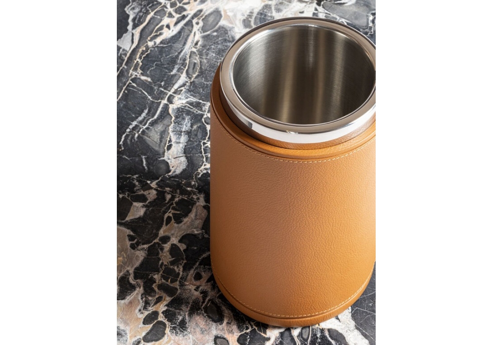 Tableware Collection designed by Giobagnara for Poltrona Frau is a cylindrical metal ice bucket covered in Pelle Frau®. Tableware Collection is available in different leather finishes.