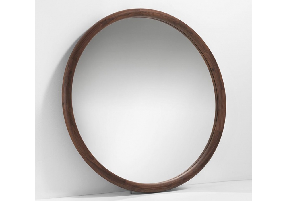 Giove designed by T. Colzani for Porada is a round wall mirror to be hang or to be leant with frame in solid canaletta walnut. It is compulsory removing the support feet to fix the mirror to the wall.