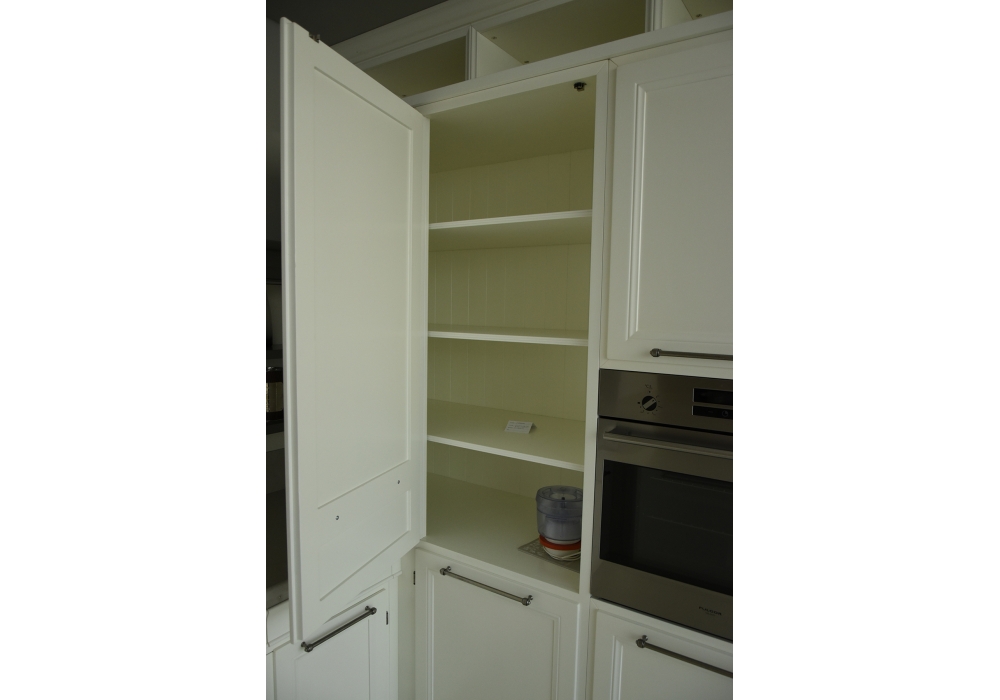 Living Design designed by L'Ottocento is a kitchen with ivory matte lacquered wood doors, gray marble worktop and natural ashwood snack top. The kitchen includes Rex fridge and dishwasher, Fulgor oven and Siemens hood.