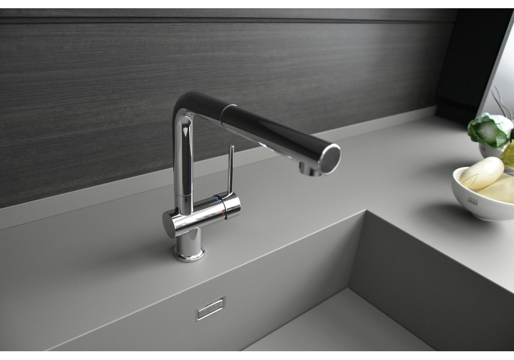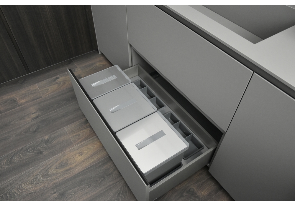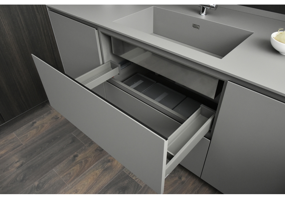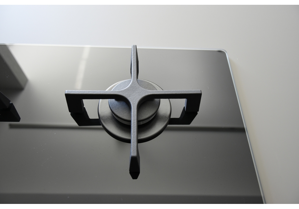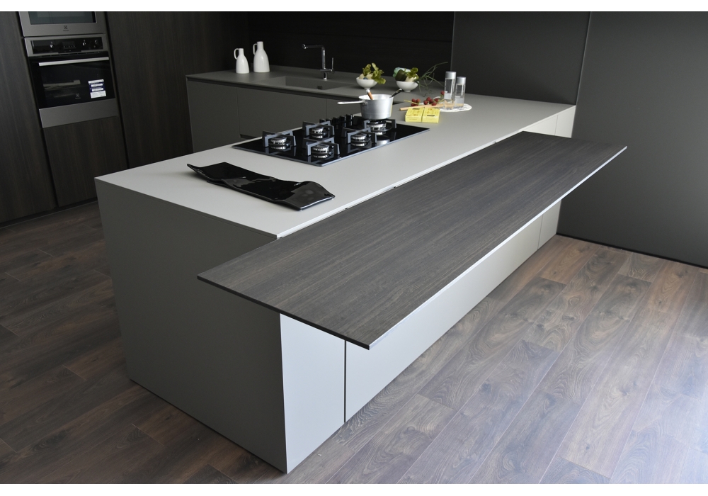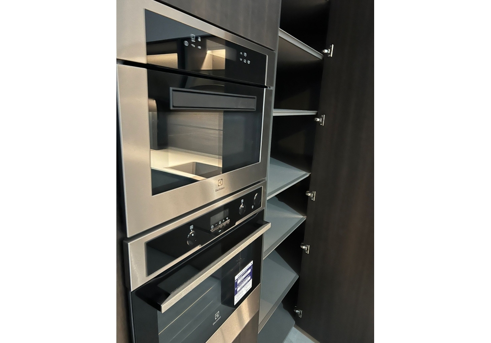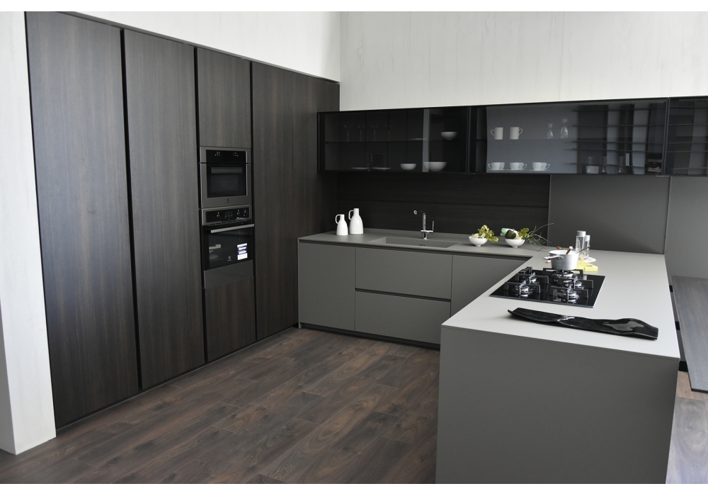 Light-MH6 by Modulnova is a composition made with components of the two kitchens. Doors in fenix atmosphere and smoked glass, top in unicolor fenix atmosphere and laminate eucalyptus unicolor snack top. Complete with Electrolux fridge, oven, microwave and dishwasher.