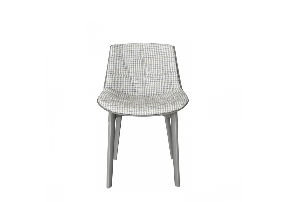 Flow Color designed by Jean Marie Massaud for MDF is a chair with upholstered shell with fabric Fall and external shell and legs in varnished aluminum, Fango colour.