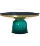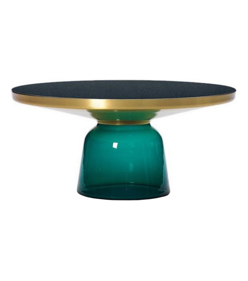 Bell designed by Sebastian Herkner for ClassiCon is a round coffee table with base in hand-blown glass, top frame in brass and tabletop in black painted crystal glass.