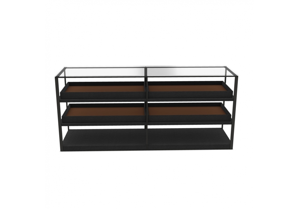 Lithos designed by Antonio Citterio for Maxalto is a container. Available with a bronzed nickel painted frame, a transparent extra-light glass top, and removable brushed black oak trays with an Alfa leather interior.