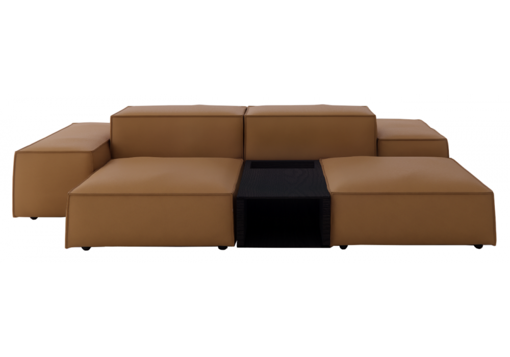 Extrasoft designed by Piero Lissoni for Living Divani is a modular sofa made with biscuit-colored leather upholstery. Side table made of wood, oak stained charcoal finish. Decorative cushions available in different sizes and upholsteries.