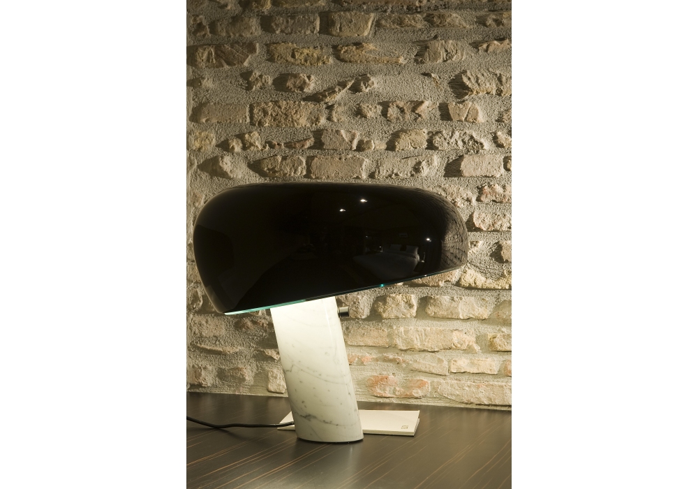 Snoopy designed by Achille & Pier Giacomo Castiglioni for Flos is a direct light table lamp with painted metal reflector and marble base. Integrated dimmer. Bulb not included.