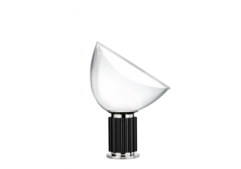 Taccia Small designed by Achille & Pier Giacomo Castiglioni for Flos is a table lamp with indirect and reflected light. Reflector in glossy white painted aluminum on the outside and matt white on the inside. Adjustable diffuser in transparent blown glass. Body in painted extruded aluminum. Base in nickel-plated ABS+PC. Electric cable with dimmer switch that guarantees the ON/OFF functions and 10-100% light flow regulation. Power supply on plug with interchangeable plugs. LED light source included.
