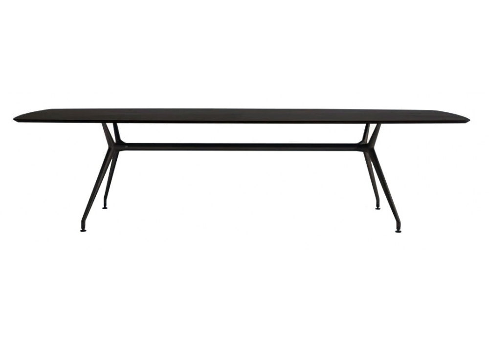 Manta designed by Giuseppe Bavuso for Rimadesio is a table with ebony stained wood top and metal structure finished in 84 Moro. Also available in a round version with a glossy yellow Kashm lacquered glass top (Ø 140 cm) and base in the same finish.