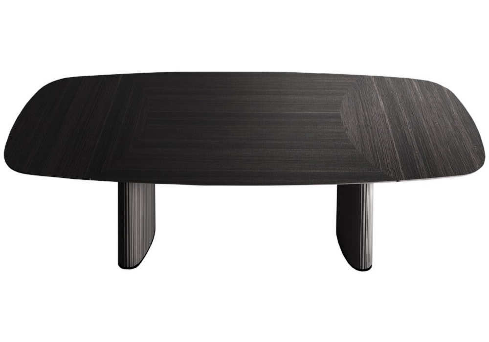 Shiro designed by Oscar & Gabriele Buratti for Gallotti&Radice is a table with inlaid wooden top in the finish “Ebano Capri”. Ovalized bases covered by solid milled wood in the finish “Ebano Capri” and black chromed metal details.