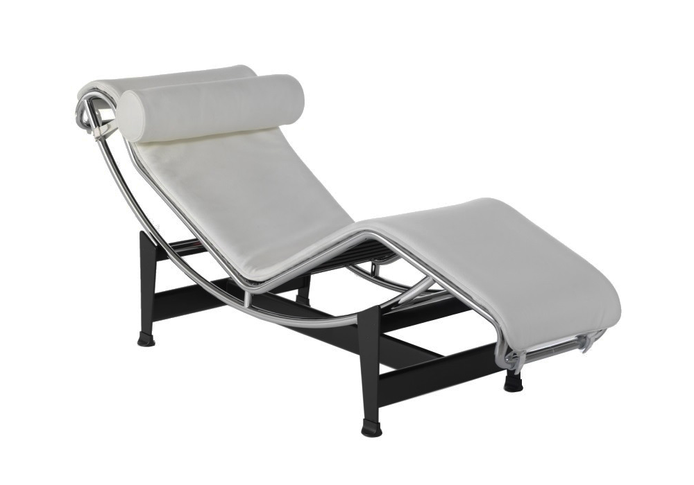 4 Chaise longue à Réglage Continu designed by Le Corbusier, Pierre Jeanneret, Charlotte Perriand for Cassina is a chaise longue made with chromed shell, matt black base and leather mattress and headrest.