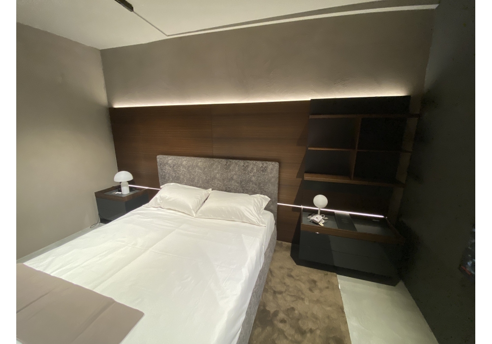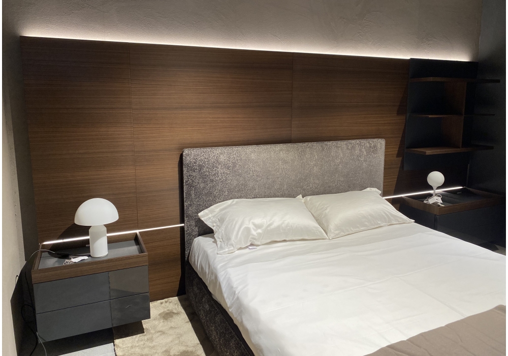 Grid designed by Vincent Van Duysen for Molteni&C is a modular system for the sleeping area equipped with eucalyptus wood paneling fixed to the wall with LED backlighting. Suspended storage units with drawers made with gray ecoskin interior and glossy anthracite structure. Wall unit with shelves in eucalyptus essence.