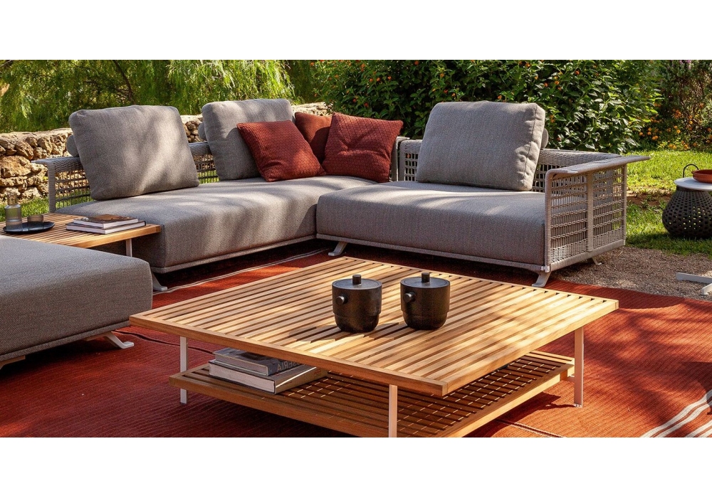 Solaria designed by Ludovica + Roberto Palomba for Poltrona Frau is a coffee table made of solid teak wooden staves in a natural finish and stainless steel base, powder-coated in chalk colour.