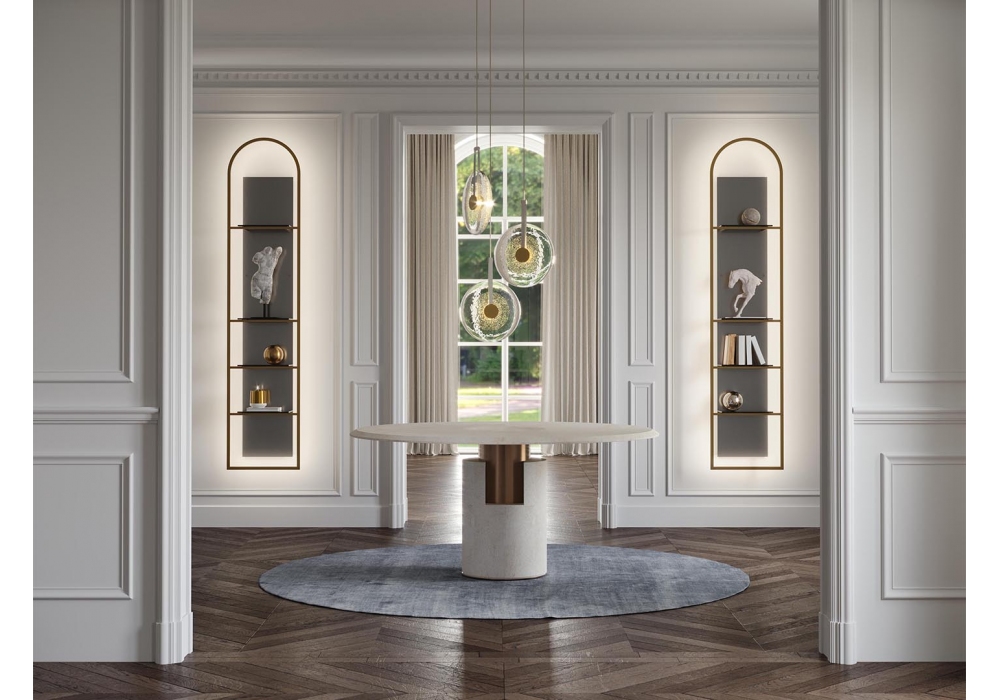 Golden Disc designed by Paolo Castelli is a pendant lamp created with handmoulded lighting element made of Murano glass, coated with three layers of gold leaf. The glass, which reflects the light and radiates it around the room, is set in a matt gold-finish metal disc and sustained by a metal support upholstered in sand-coloured leather. Each element comes with a rose made of matt gold-finish metal and an electrical support cable with a maximum length of 2 metres.