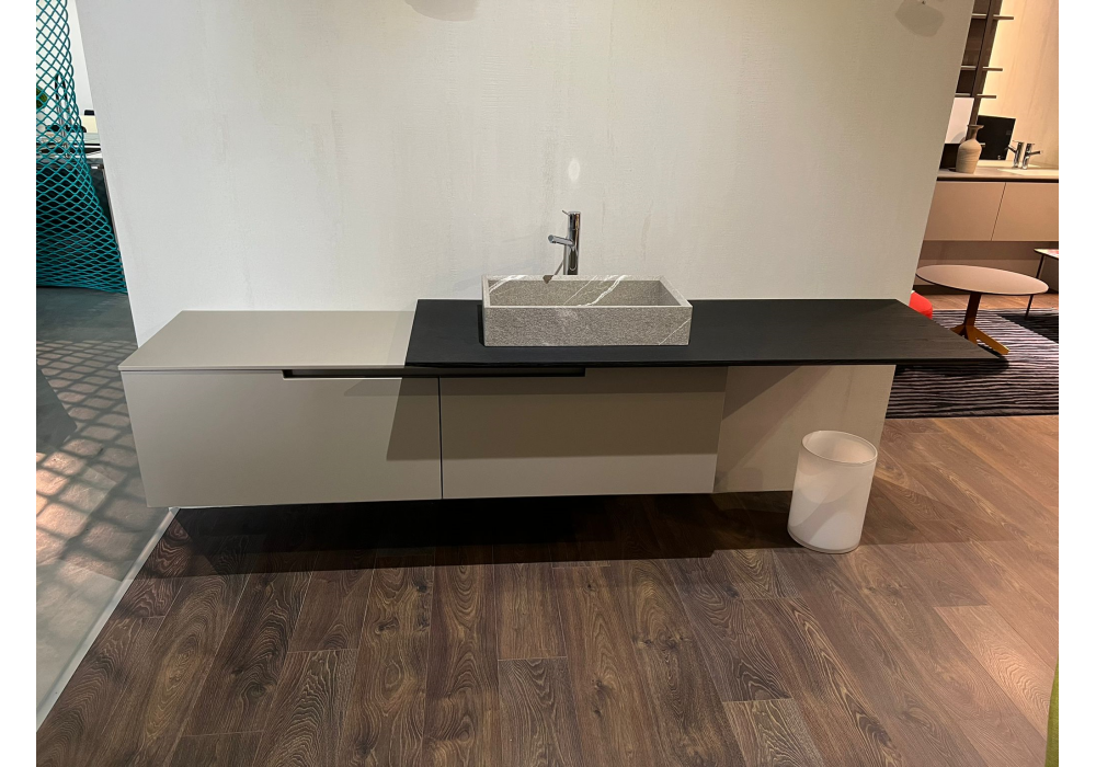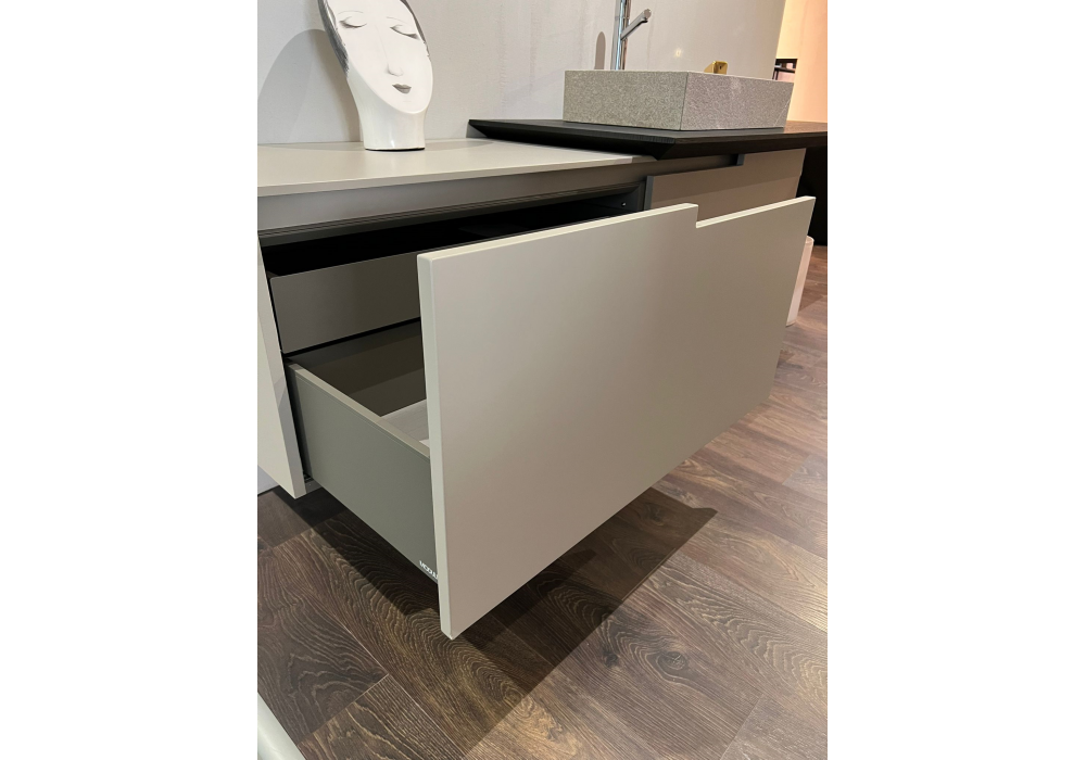 Moon Cross designed by Modulnova is a bathroom system made with a smoked oak wood top, square countertop washbasin in flamed Piasentina stone and drawers in satin lacquered melamine.