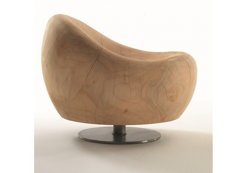 Maui designed by Terry Dwan for Riva 1920 is an armchair with swivel base with tubular leg and iron plate and shell in solid scented cedar worked from a single block.