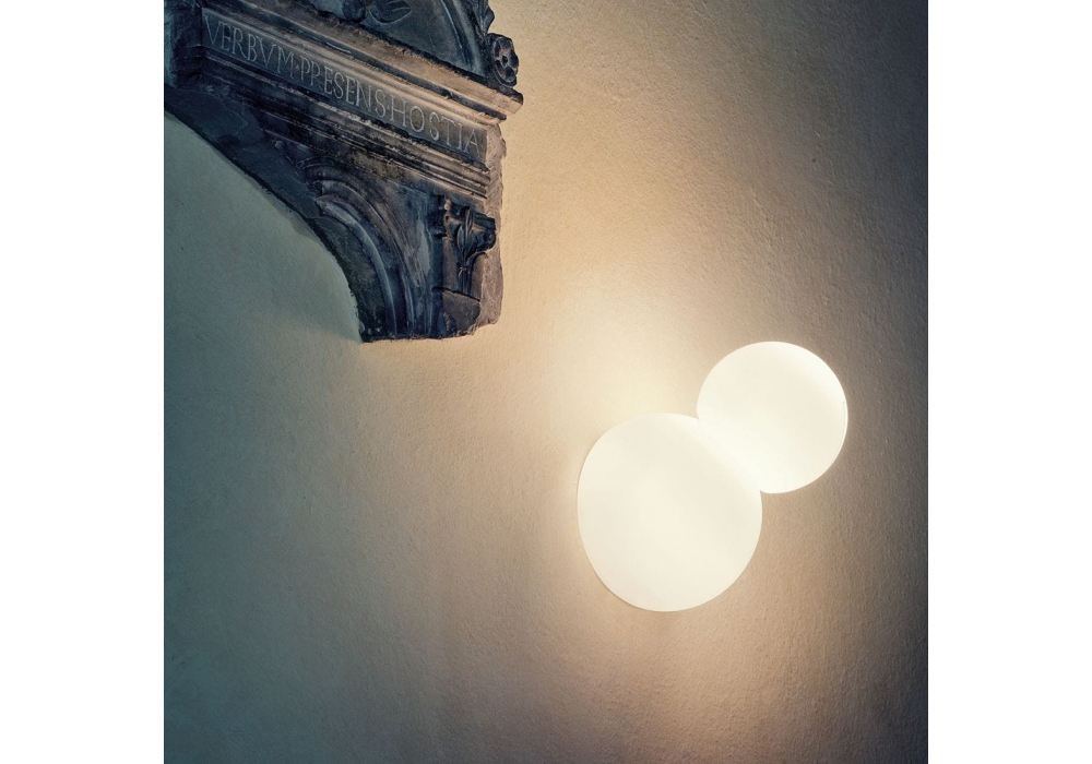Bruco designed by Vico Magistretti for Fontana Arte is a wall lamp, with structure in nickel-plated metal. The diffuser is spherical in white satin blown glass.