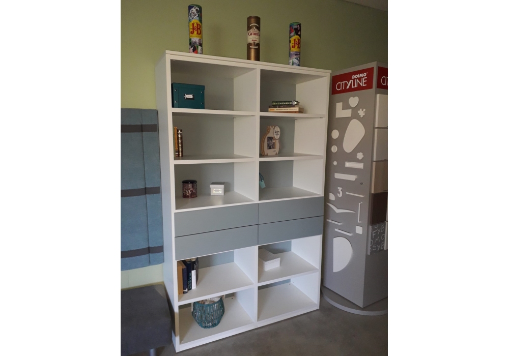 Teca Colonna designed by Doimo CityLine is a bookshelf with white lacquered structure and 4 "push-pull" drawers in blue "tirreno" finish.
