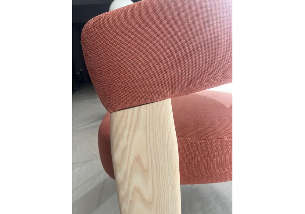 Oru designed by Patricia Urquiola for Andreu World is an armchair with structure in natural ash wood and seat and backrest covering in 1758: Jacquard Three fabric.