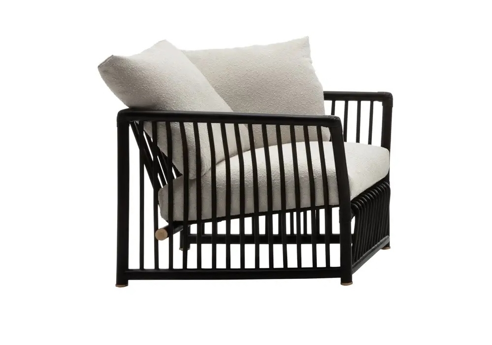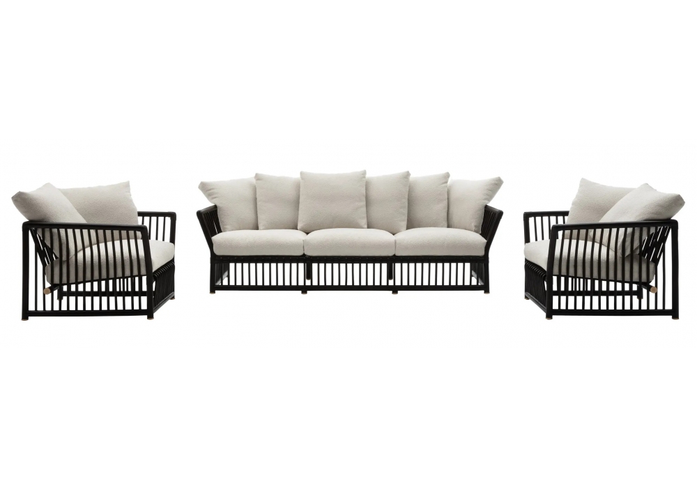 Softcage designed by Mario Bellini for B&B Italia Outdoor is an outdoor armchair made with black stained rattan structure, seat and backrest cushions in fabric and feet in brass-effect anodized aluminium.