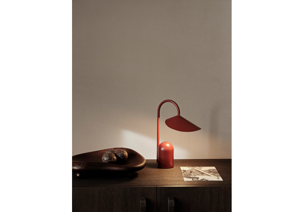 Arum designed by Ferm Living is a portable lamp made with a powder-coated iron structure and aluminum lampshade with red oxide finish. Matte off-white interior with LED dome.