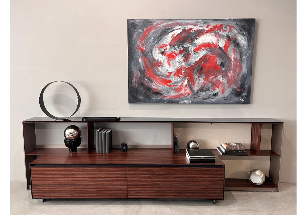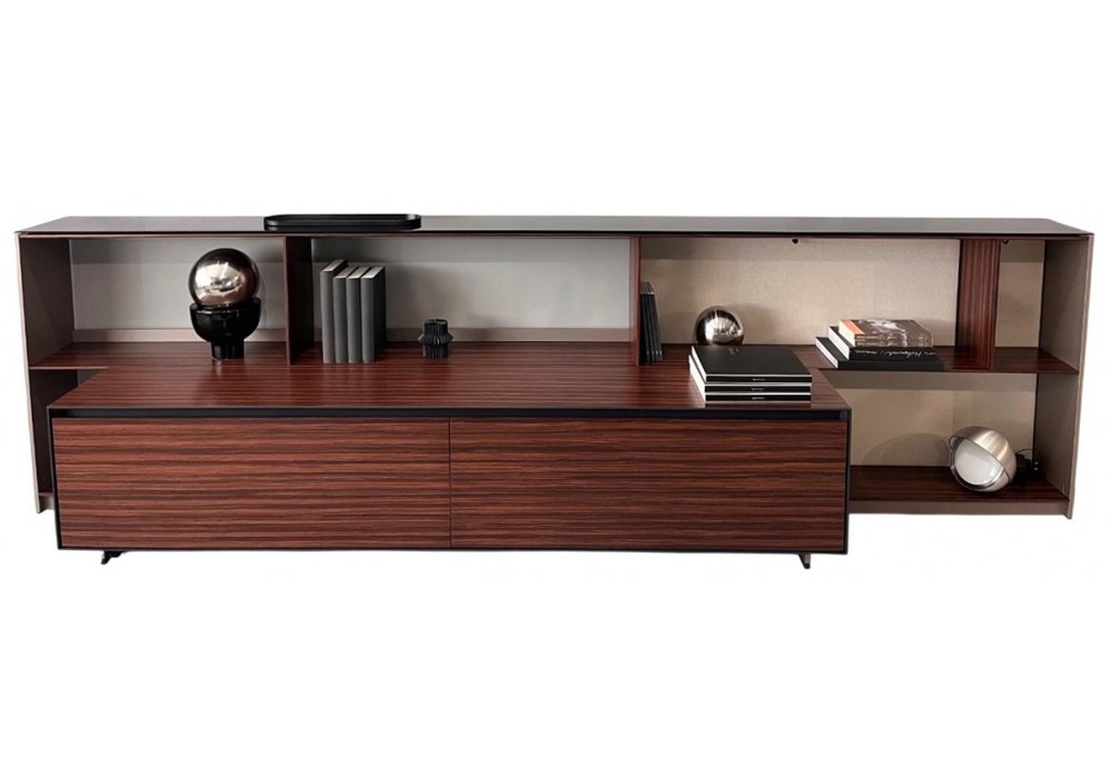 Flat.C designed by Antonio Citterio for B&B Italia is a bookcase, characterized by a Eneo bronze painted metal structure. The shelves, dividers, drawers and external structure are in semi-gloss multilaminar rosewood. The top is in painted bronzed reflective glass. The internal structure is in satin anthracite (9907E). The profiles are in black anodized aluminum and the backrest is covered in Asolo sand fabric.
