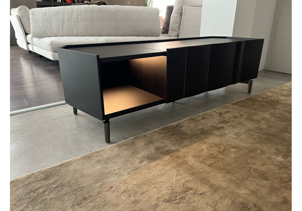 Delphi designed by Carlo Colombo for Giorgetti is a sideboard with dark canaletto walnut fronts and leather top and shelves.