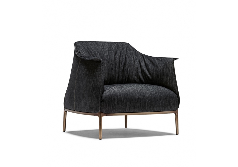 Archibald Denim Edition designed by Jean Marie Massaud Poltrona Frau is an armchair made with organic cotton jacquard fabric upholstery that features the typical twill structure of denim, made with a special wash that makes it even more resistant and suitable for covering upholstered furniture. The cotton, of natural origin, is GOTS (Global Organic Textile Standard) certified, and can be dry cleaned. Base in antiqued bronze. In addition, the armchair is embellished with a Camel-colored Cuoio Saddle Extra label, with the heat-stamped logo and the words “Archibald Denim Edition. Unique, like you” sewn on the back. Unique like all the pieces that are handmade by Poltrona Frau artisans.