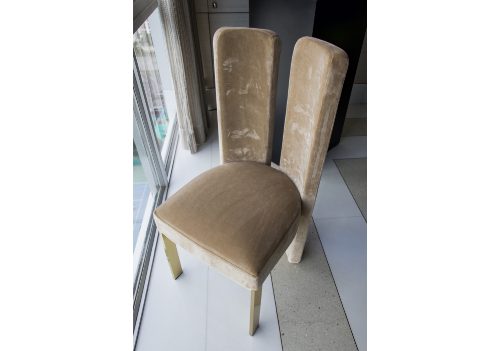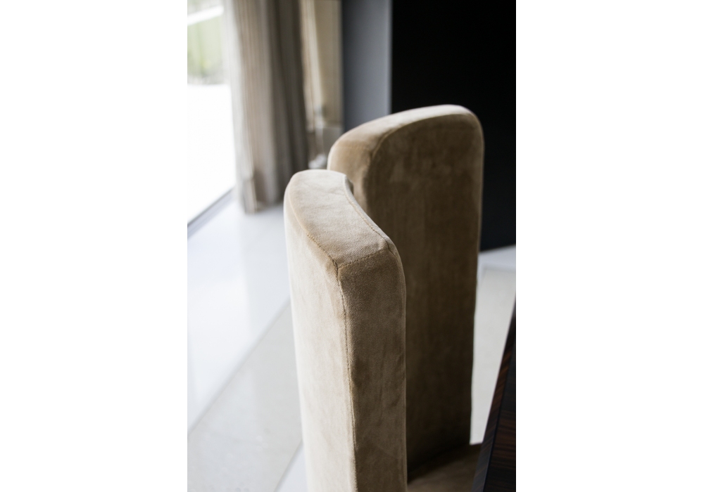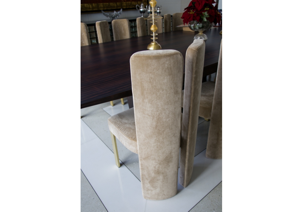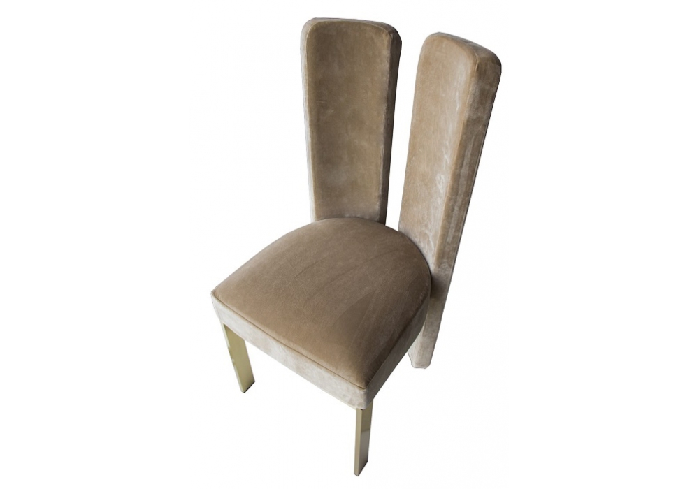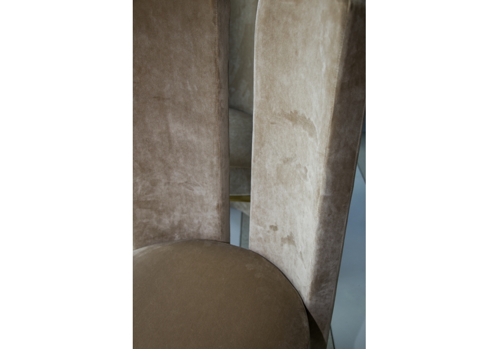 Nina designed by Elena Pancaldi for Emmemobili is a chair with a structure made of curved plywood with foam rubber padding covered in velvet. The base is made of brass.