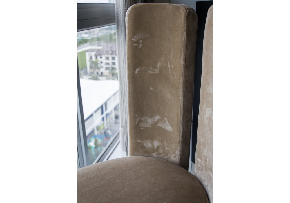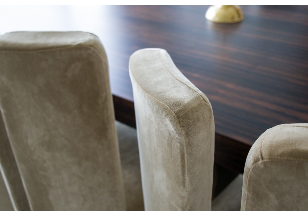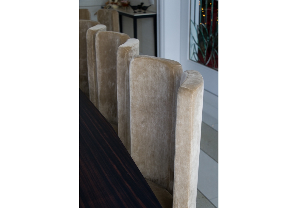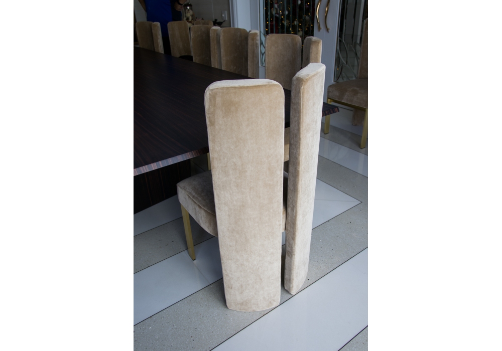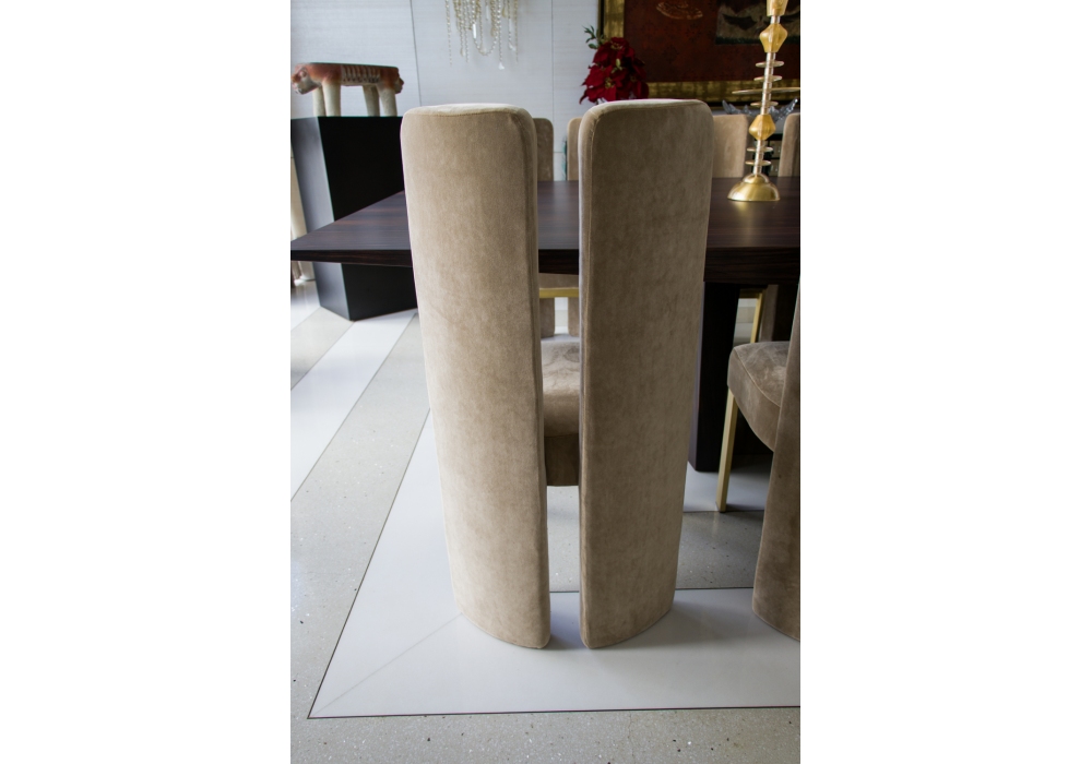 Nina designed by Elena Pancaldi for Emmemobili is a chair with a structure made of curved plywood with foam rubber padding covered in velvet. The base is made of brass.
