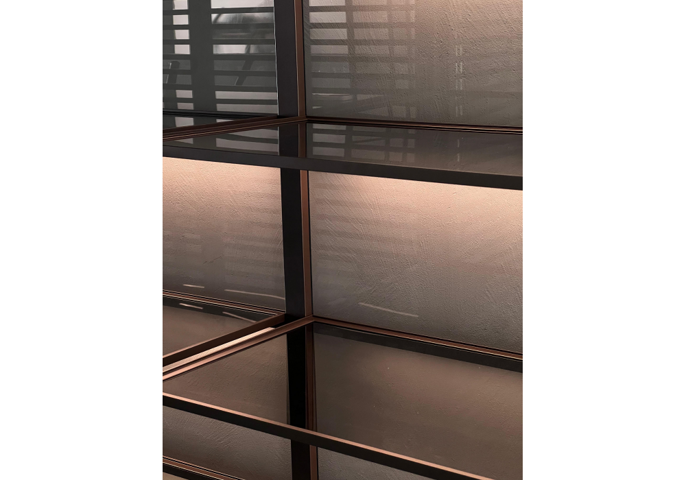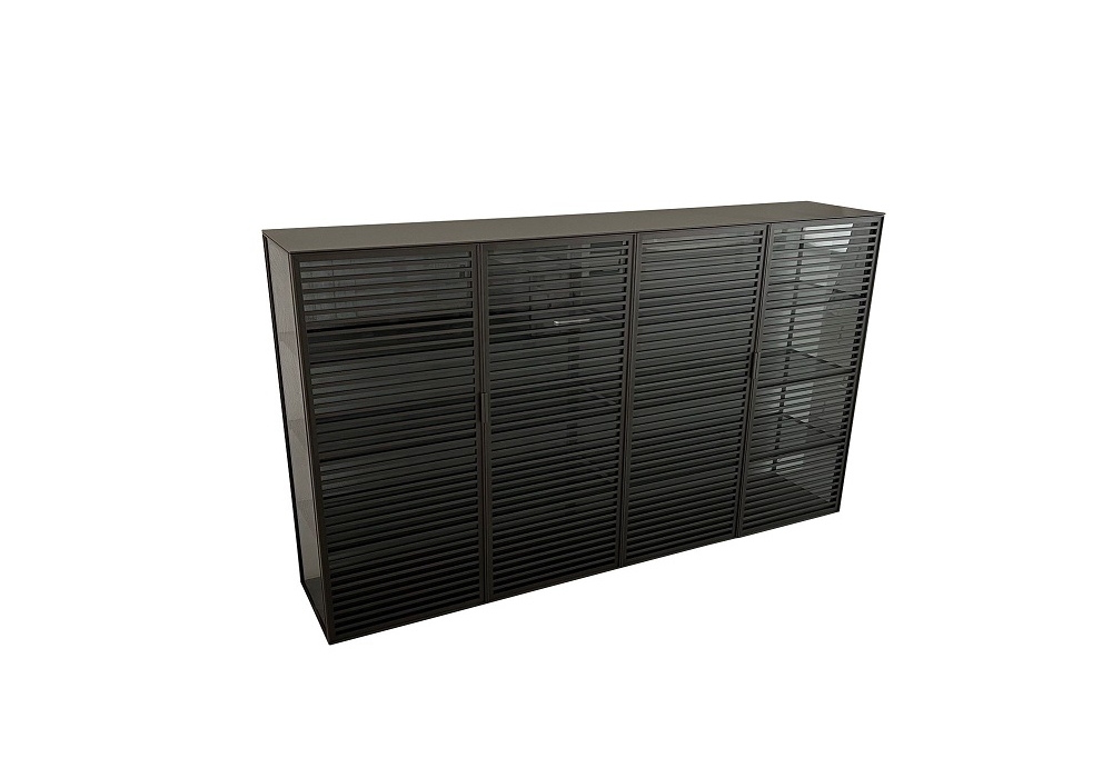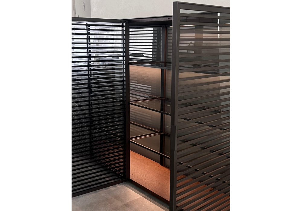 Alambra designed by Giuseppe Bavuso for Rimadesio is a cabinet made with a Brown structure combined with heat-treated oak wood. The doors, sides and shelves are in transparent grey glass, while the top is in opaque coffee-coloured glass.