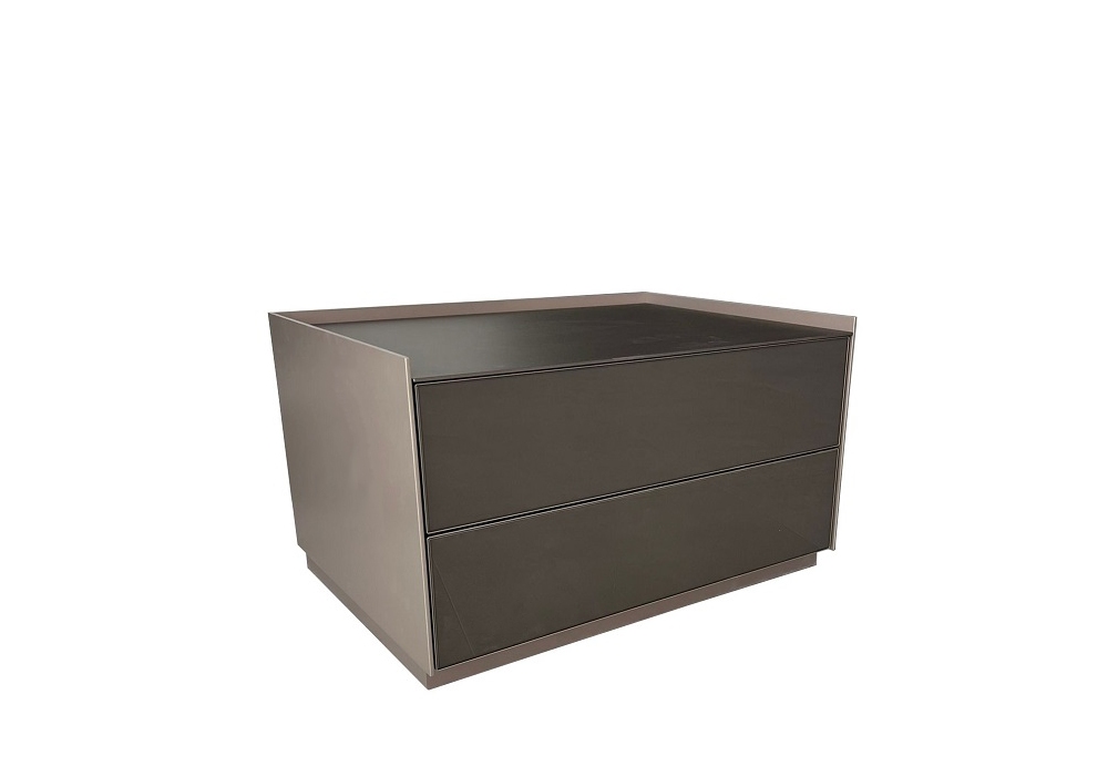 Self Bold designed by Giuseppe Bavuso for Rimadesio is a container with 2 drawers made with Ecolorsystem 303 Bronzo sides and profiles, brown leather melamine interiors. Top and back 136 Matt Bronze, fronts 58 Caffè. Placemats 154 Clay imitation leather.