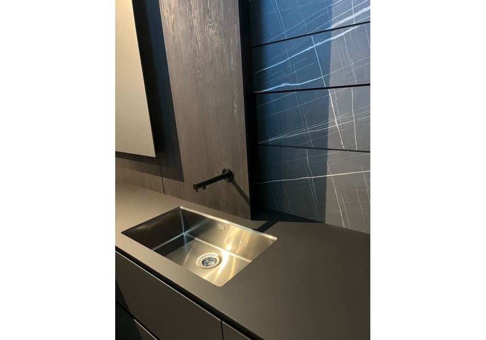 Skill Super Matt designed by Modulnova is a kitchen with an essential and contemporary design, characterized by doors in Super Matt Lead Grey and Sahara metallic lacquered finish, with a push-open opening system or Skill handle in matt black. The frames are available in Grigio Texture or Milltech Rovere Fossile, contrasting or in harmony with the doors. The feet, of variable height (H.1.5 or H.6), adapt to different configurations. The internal components are entrusted to the BLUM "Basic" system in the black or grey variants, for drawers, chests of drawers and internal compartments, guaranteeing functionality and aesthetic cleanliness.