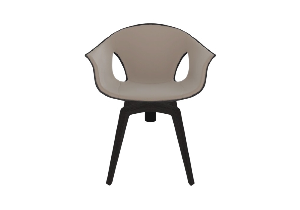 Ginger designed by Roberto Lazzeroni for Poltrona Frau is a swivel small armchair with wooden legs and shell made of molded composite thermoplastic polymer padded with polyurethane foam. Fully upholstered in the options that combine saddle-leather for the external shell with leather for the internal surface of the seat.