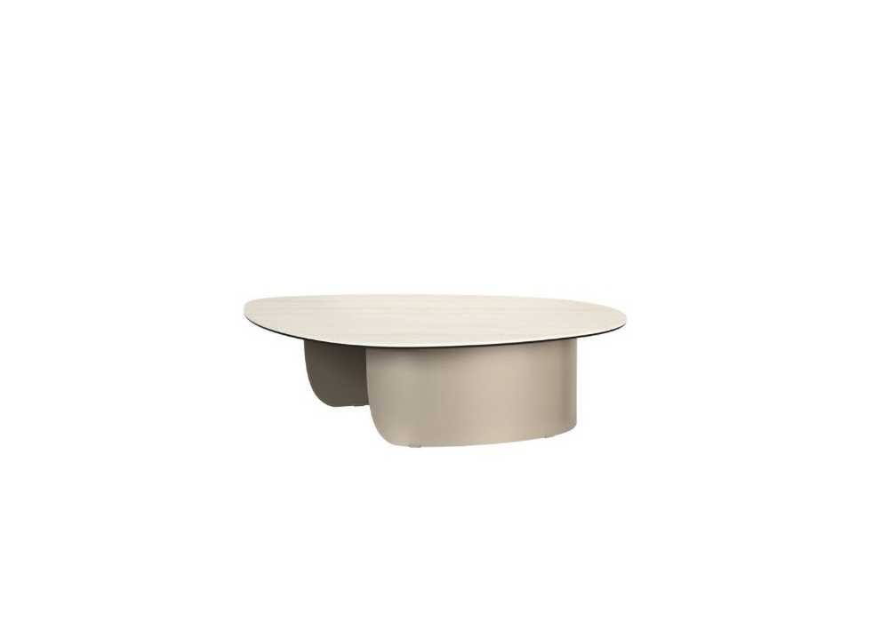 Twins designed by Archirivolto for Calligaris is a coffee table made with a white travertine top and a curved sheet metal base.