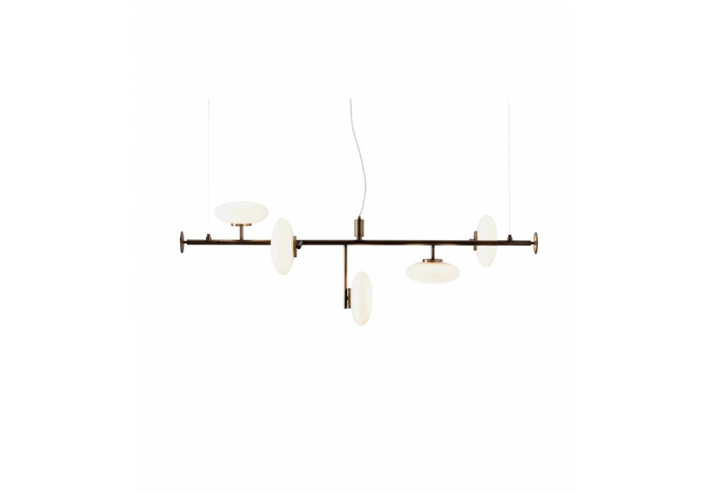 Mamì Horizontal designed by Umberto Asnago for Penta is a pendant lamp with structure in brushed bronze colored metal. The diffusers are in white blown glass and adopt a dimmable LED light source in different gradations of light.