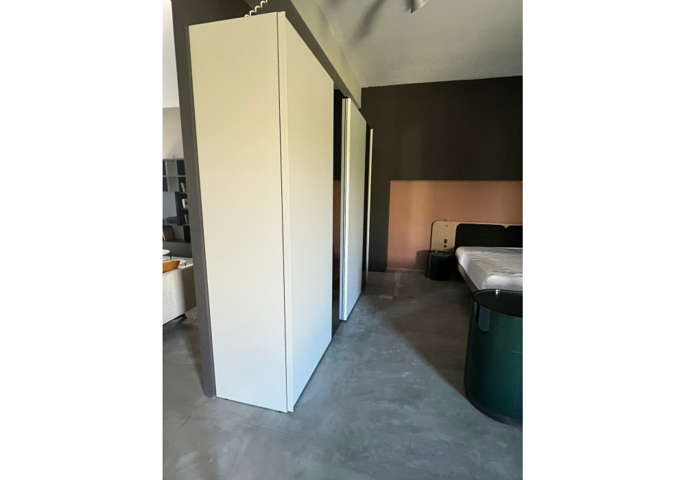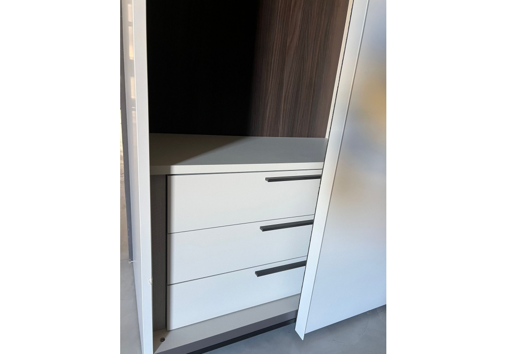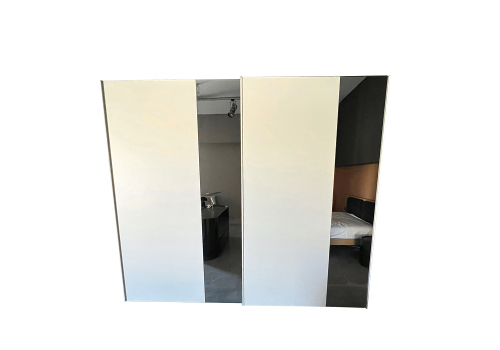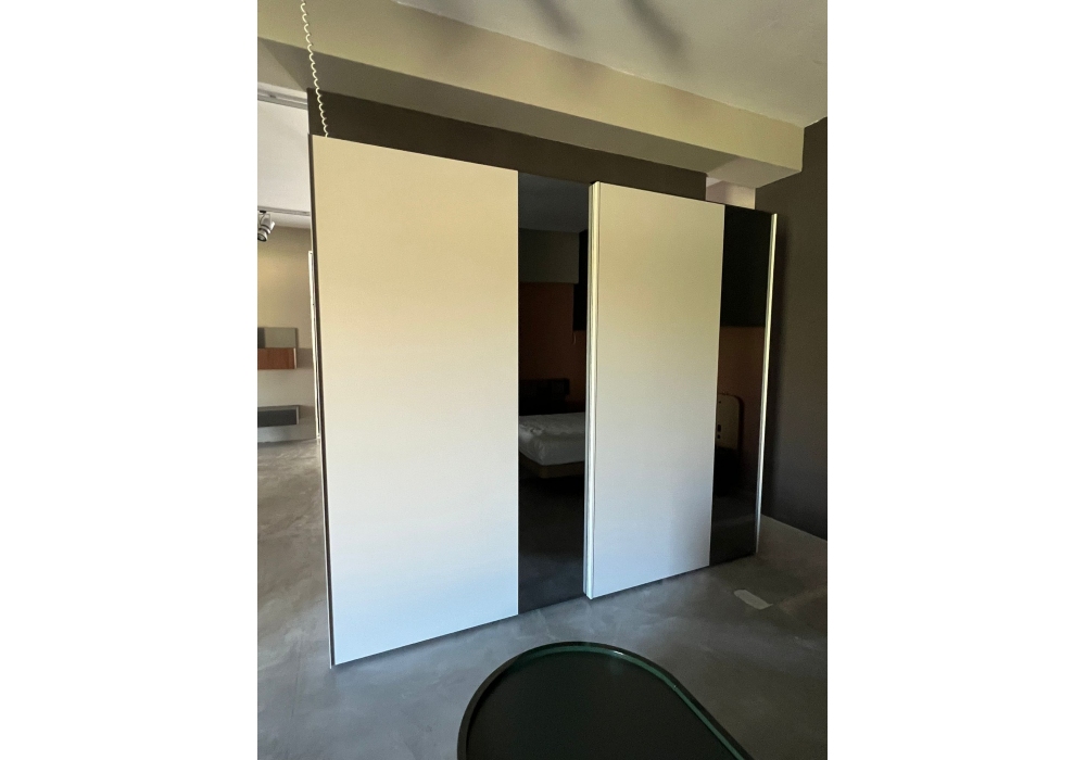 Poker 2.0 designed by Alf DaFrè is a wardrobe with Costanza model sliding doors and premium hardware. The frame is in matte dove grey, the sides are in smooth dove grey melamine, and the central panel features a grey mirror. The interior is in Skin Effect melamine with a matching 3-drawer chest. The "Z" handle and hanging rail are in Umber Shine finish. A sliding LED strip with transformer and plug is included.