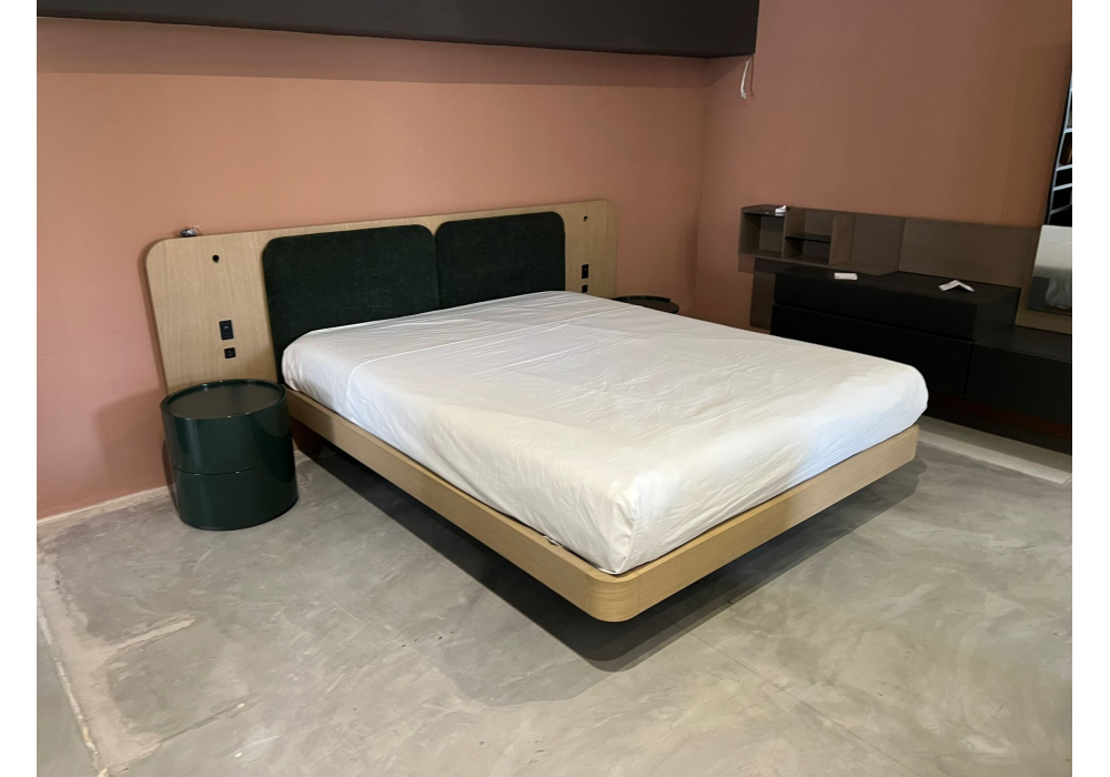 Grand Voile designed by Alf DaFrè is a bed with a hemp oak-finish headboard and a padded fabric-covered cushion. Integrated lighting includes an LED strip behind the headboard and an LED bar on the platform. It comes with an orthopedic base without legs and an electrical system with USB ports on both sides.