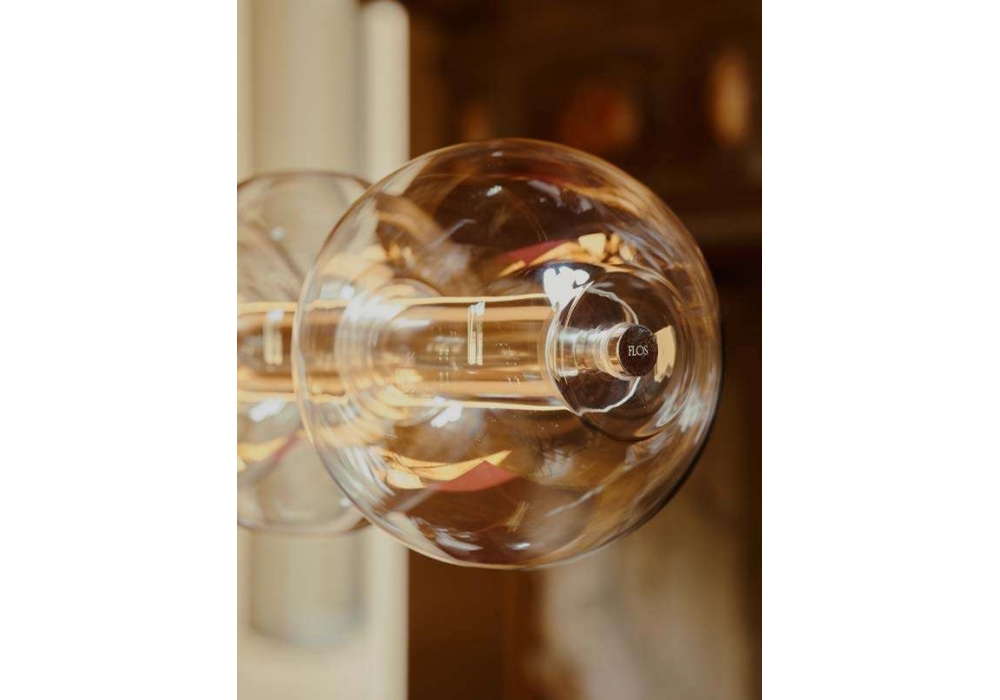 Luce Sferica designed by Ronan Bouroullec for Flos is a pendant lamp made with a polished extruded aluminum structure, spherical modules in transparent borosilicate glass. Power supply integrated into the rosette. Touch control button, positioned on one end of the product, to control the device in three different modes.